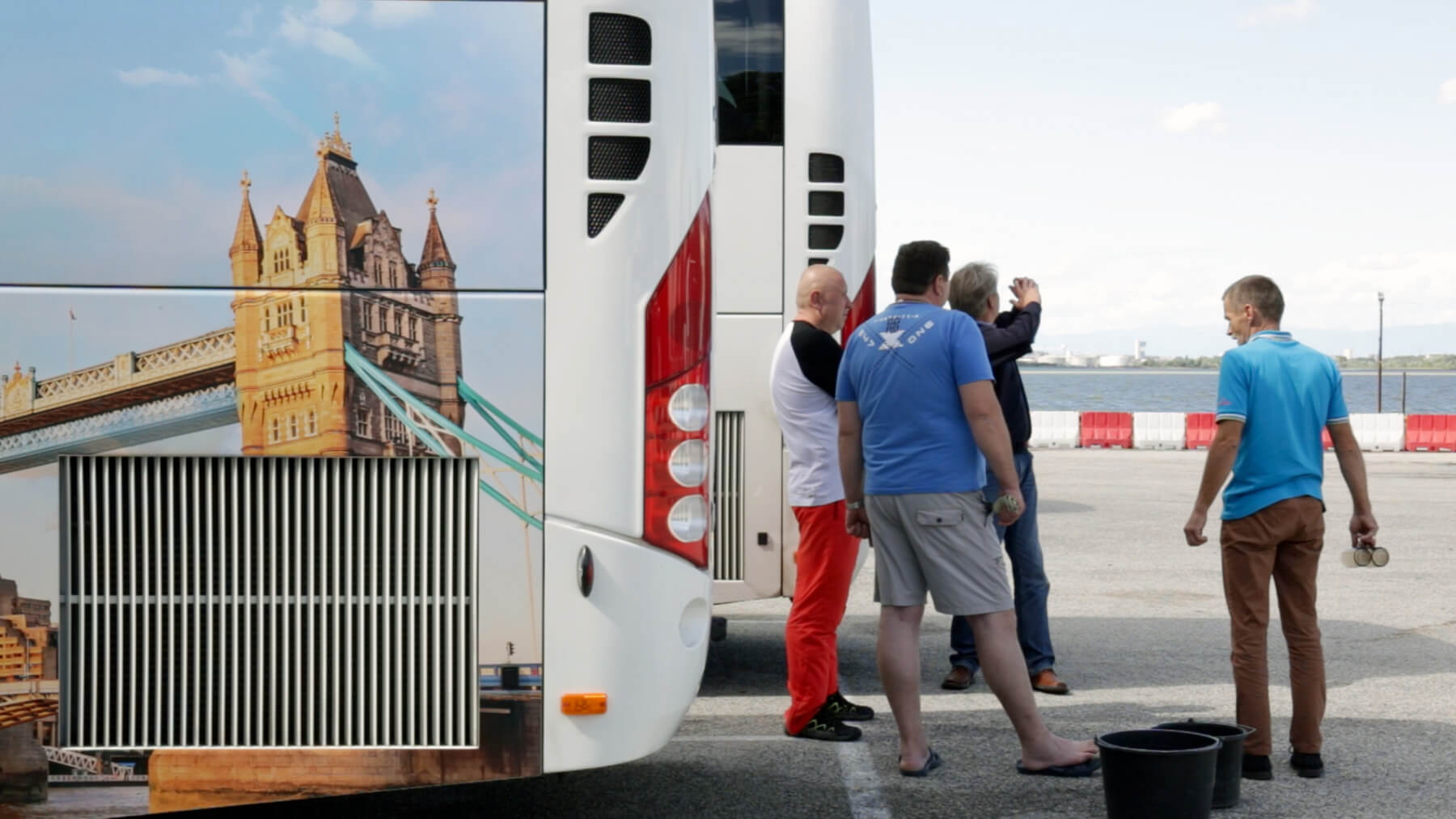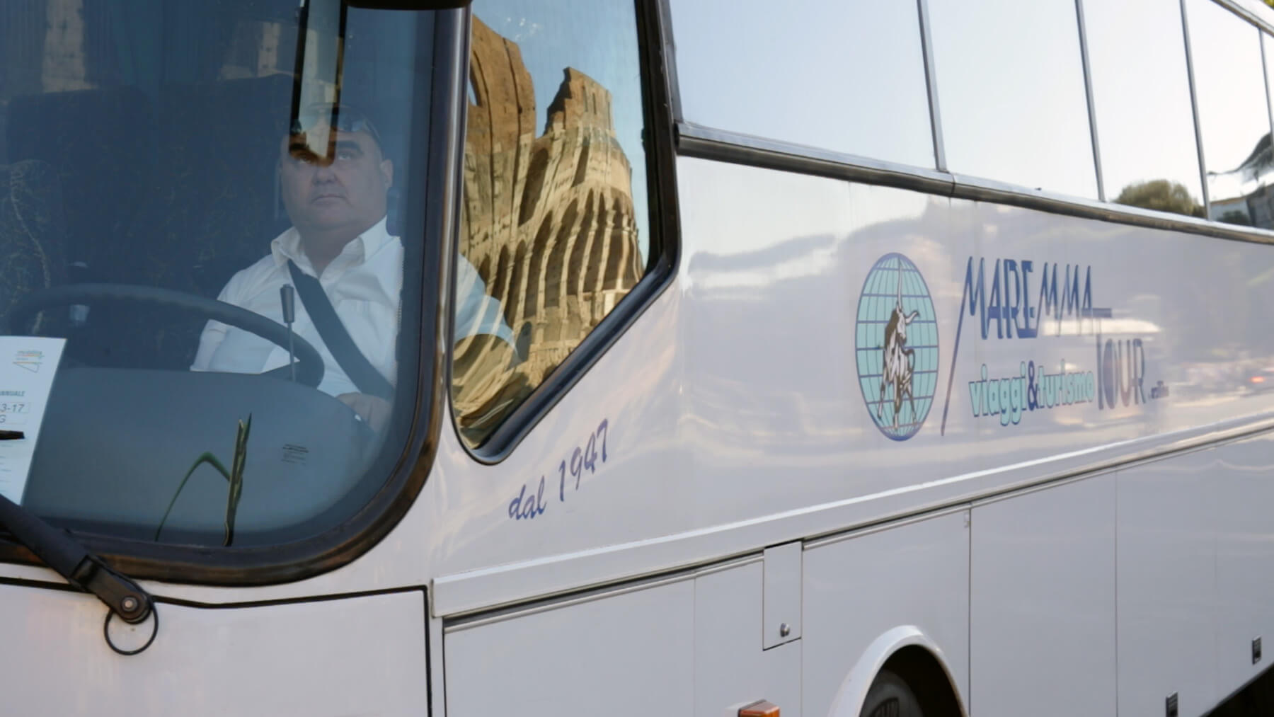 Tour De Force is a film about buses. Shot in Rome, Venice, and Milan, Tour De Force offers an unusual perspective on a widespread phenomenon: tourism on wheels. Engines, tyres, livery, drivers, and weary passengers are the main characters in a visual tale that calls into question the city experience connected to modern mass tourism. The fixed tourist bus itineraries and open-top city-sightseeing tours that can now be found in over a hundred city centres worldwide are totally cut off from the communities that flourish in the side streets, sticking instead to a branded, icon-strewn landscape, perfect as a selfie backdrop to be geo-tagged on social media. As the city itself tends to redesign and reconfigure itself to line up with its touristic image, passengers’ smartphones capture shots of cities already reduced to postcard images, just like those that appear on the buses themselves.